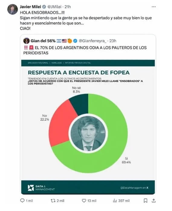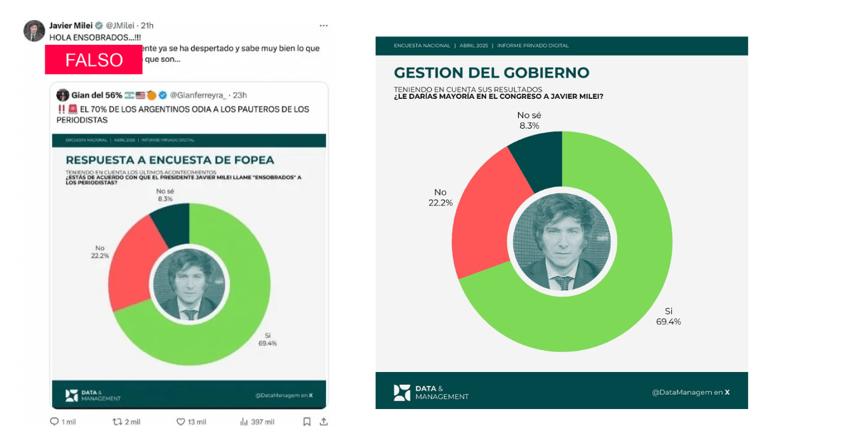 La desinformación fue difundida originalmente por “Data & Management” (@DataManagem), una supuesta consultora en X que promociona encuestas digitales sin metodología ni trazabilidad. Curiosamente, el gráfico atribuido a FOPEA es una copia exacta del que la misma cuenta publicó el día anterior sobre otro tema. Aun así, fue replicado por múltiples cuentas afines al oficialismo y retuiteado por el propio Milei, que agregó su habitual “CIAO ENSOBRADOS!!!”.